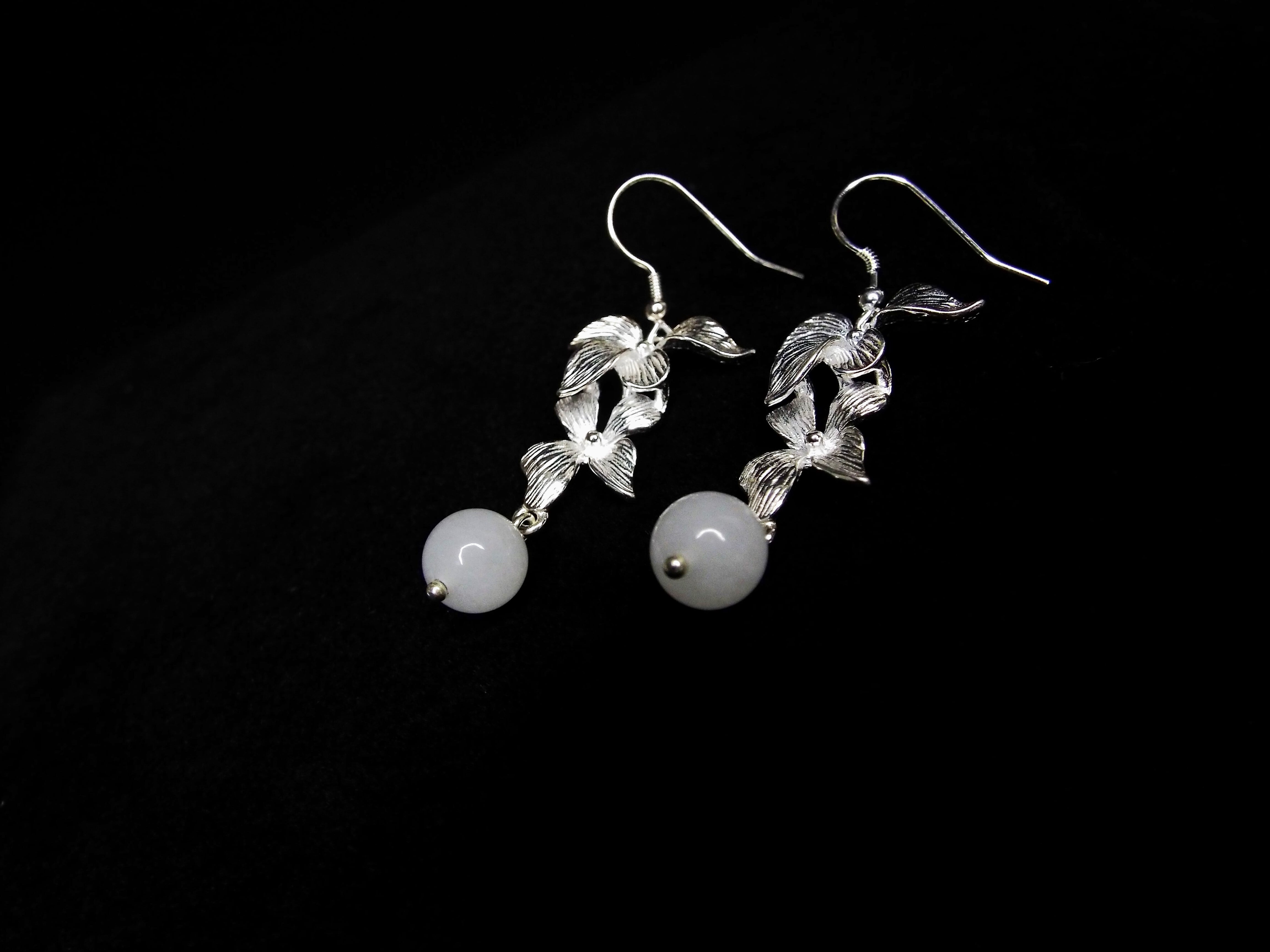 S925 シルバーピアス ヒスイ付きフークピアス 花綴り 独自デザインピアス。