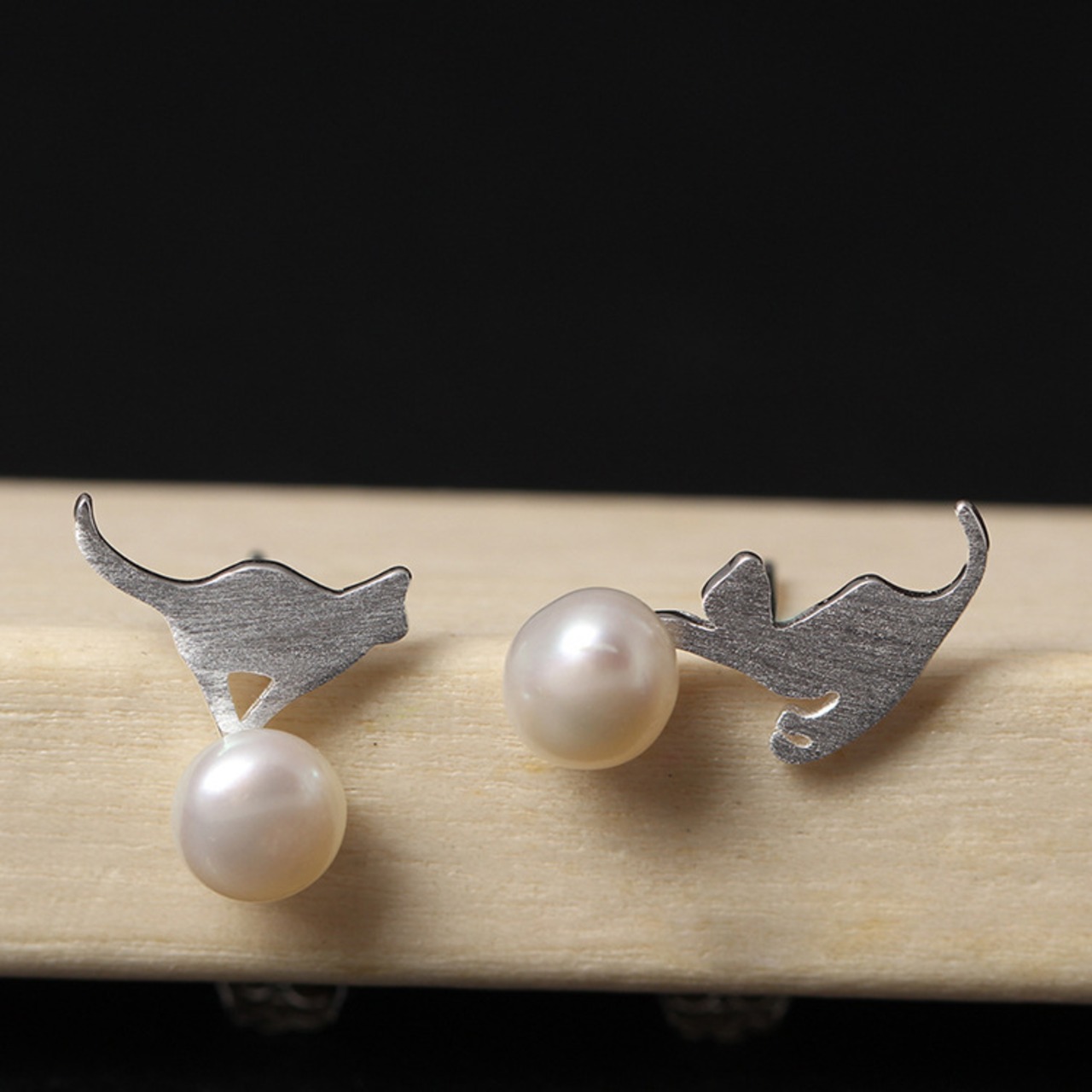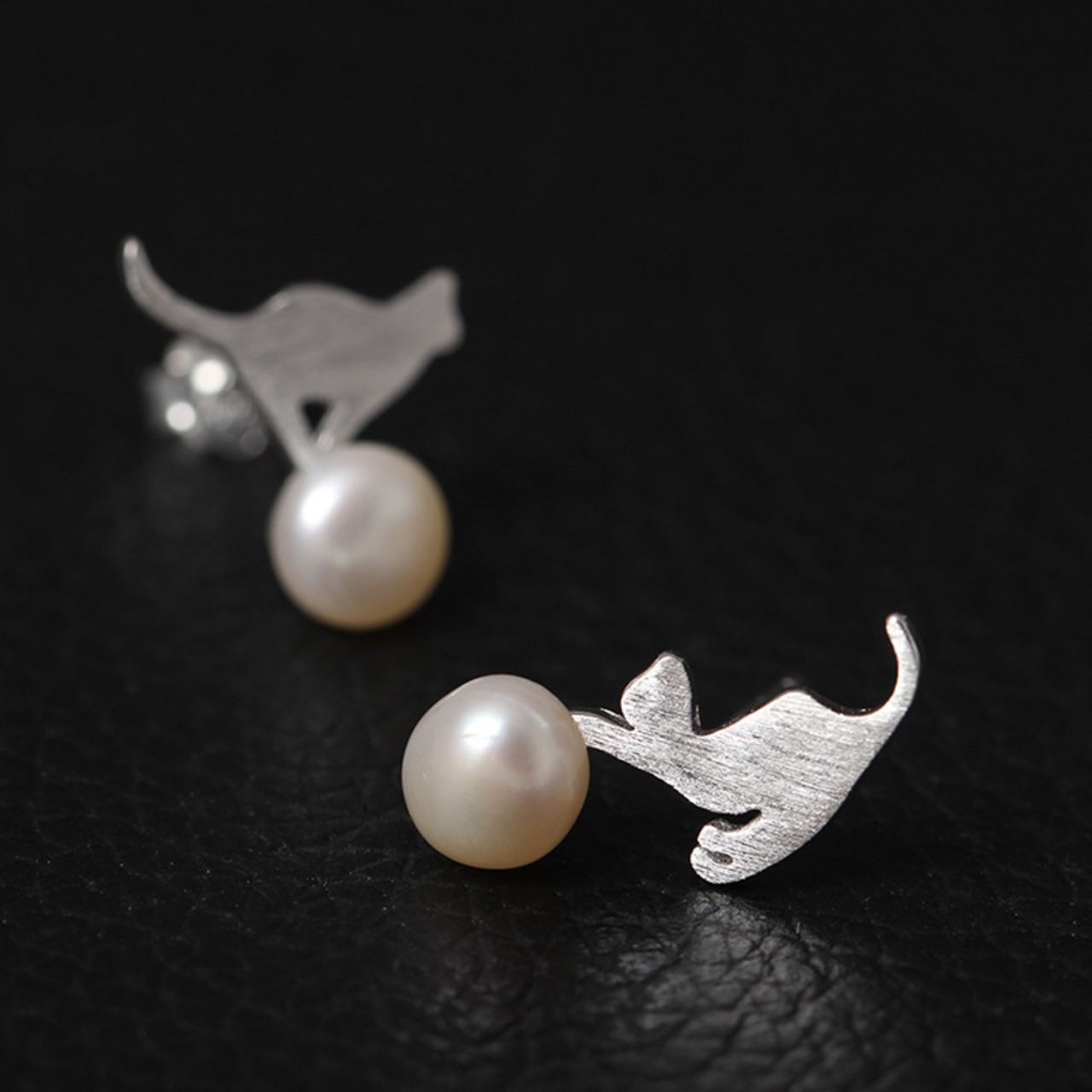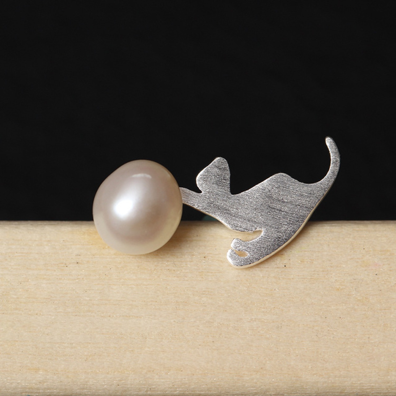 商品名:じゃれ猫 S925 シルバー 淡水パール付きスタッドピアス