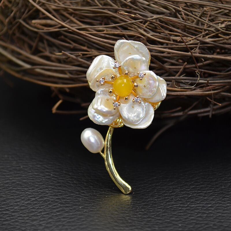 素材: 花びら部分:バロック真珠,しべ部分:蜜蝋琥珀、金属部分:ブラス14K金メッキ